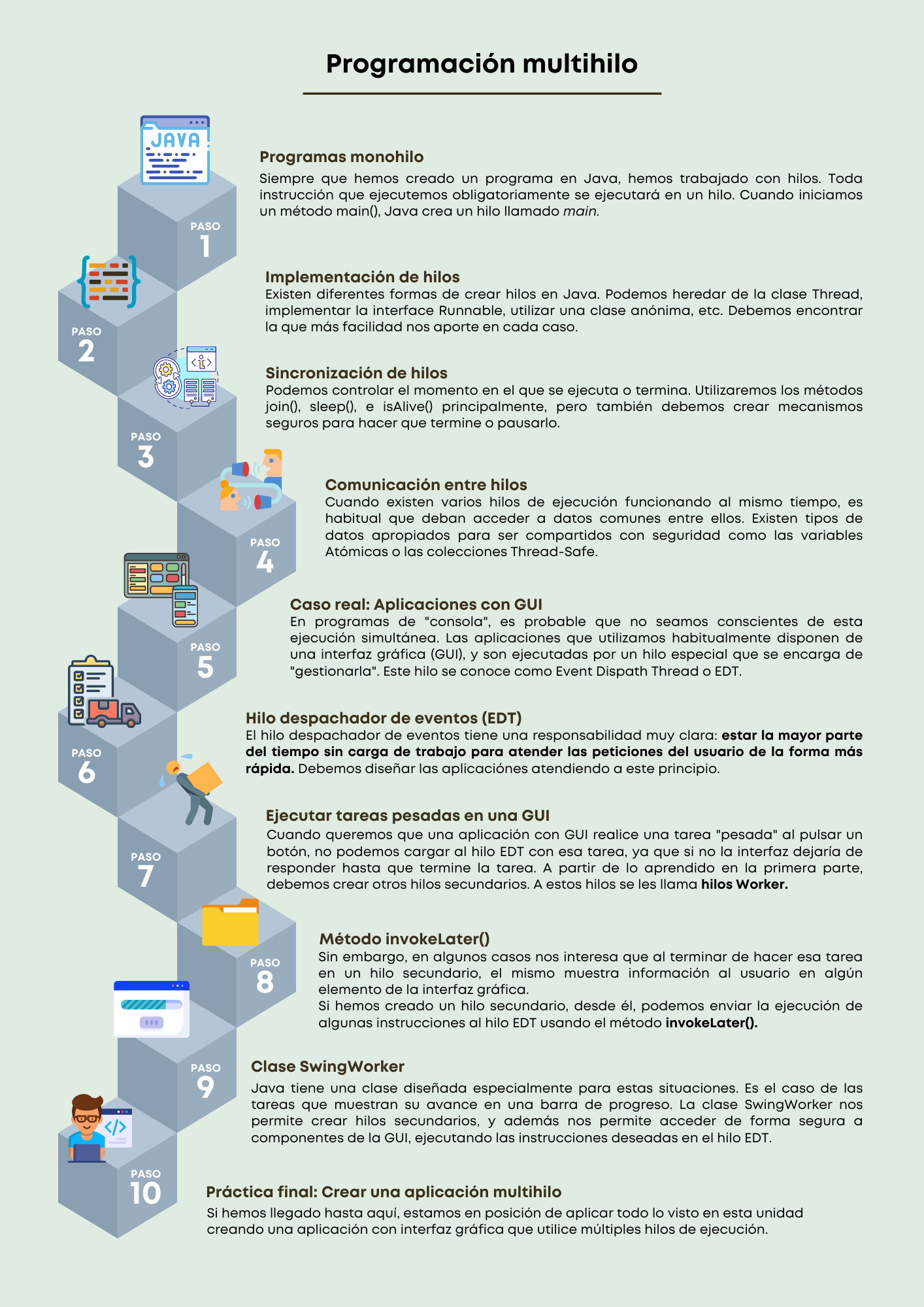 - Si desde un hilo worker con una tarea de larga duración, necesito modificar el estado de componentes de Swing, debo enviar esas tareas de modificación a la cola del EDT.